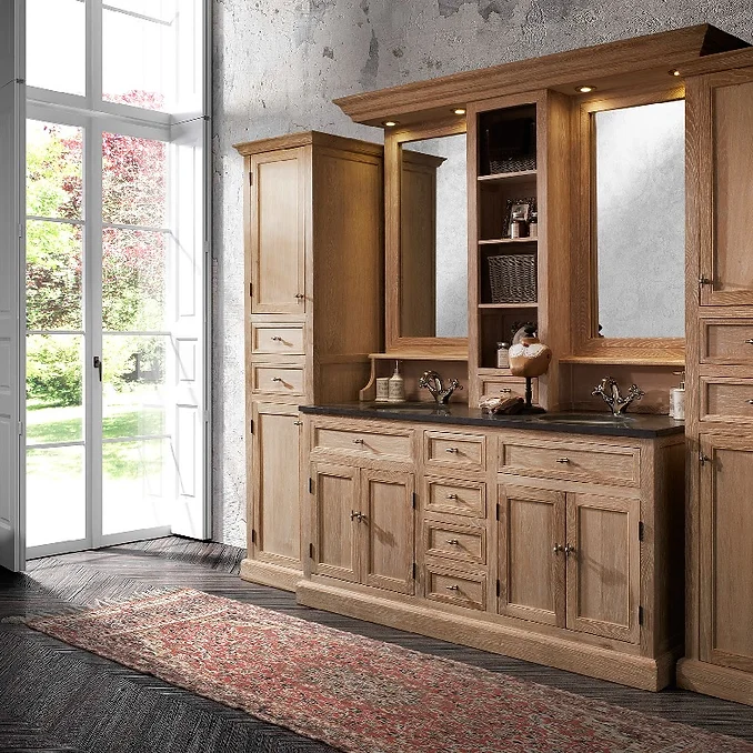 Breed assortiment: complete houten eetkamers, stijlvolle houten badkamermeubelen en zelfs poolhouse keukens, eiken kleerkasten.